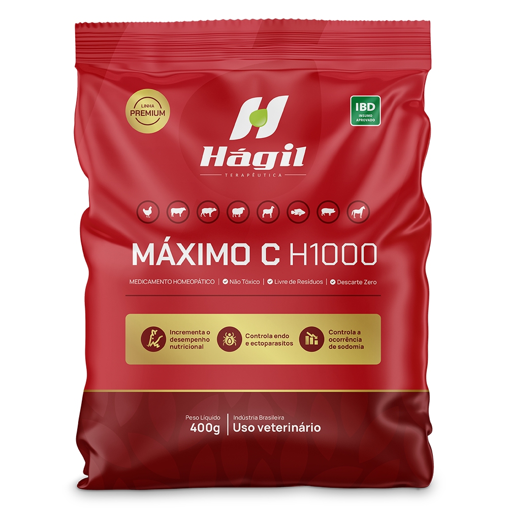 Máximo C H1000 é um medicamento de performance, que propõe melhorar o desempenho, diante dos desafios da produção, do manejo e do clima, melhorando o desempenho, reduzindo a morbidade, refugos e mortalidade. Seu uso deve ser constante desde a chegada do lote, podendo ser associado a outros produtos da linha Hágil.